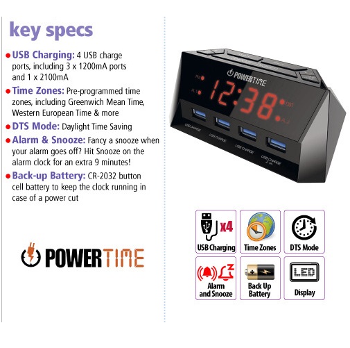 • Power Your Time – Not Only a Clock BEARE POWERTIME Charging Alarm Clock not only keeps you on track with its alarm and clock features, it also provides power to keep your devices fully charged. 0.6” white LED display for easy readability both day and night. Brightness levels can easily be adjusted by tapping the DIMMER button.