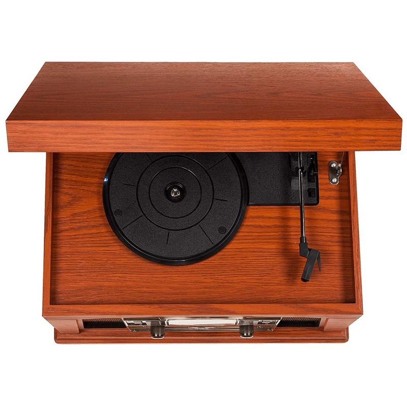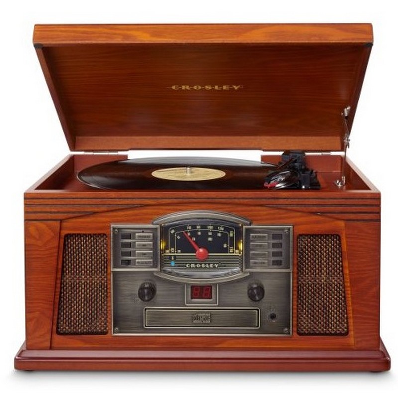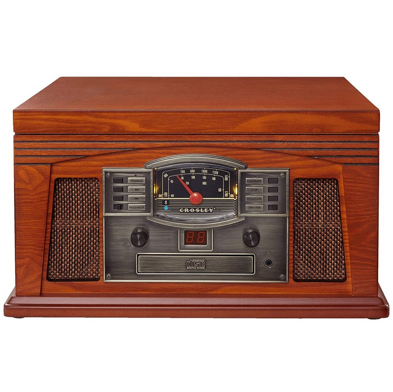 Tune in the nostalgic Crosley Lancaster to hear music as it should be heard. An antique-styled cabinet with handsome grillwork details and aviator dial houses a CD player, an AM/FM radio, and a three-speed record player for all of those classic vinyls.