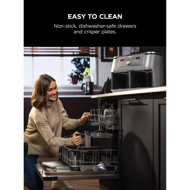 Dual Zone cooking just got a brand new look. Meet the large capacity air fryer that cooks 2 foods, 2 ways, and finishes at the same time – now with an updated design and sleek, dark grey metallic trim.
