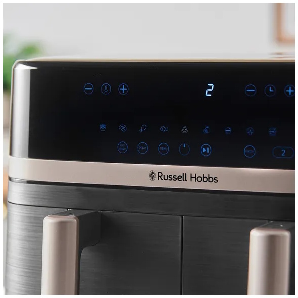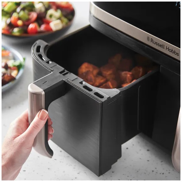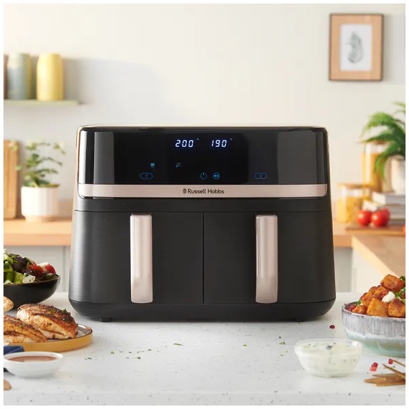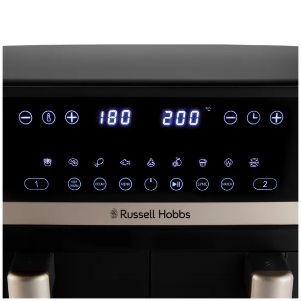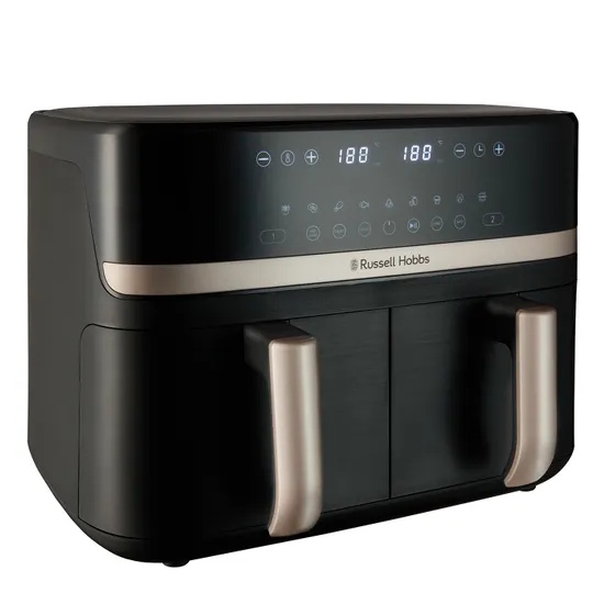 The Russell Hobbs® Satisfry Dual Basket Air Fryer is ready to take your cooking up a notch. The 2 baskets, each with an ample 4.5l capacity, are housed in a stylish black and Champagne-accented surround that will look smart in any kitchen. The digital touch screen and temperature controls make operating the 2 cooking zones quick and easy. Sync both baskets and let the Satisfry ensure your chunky chips and succulent steak are ready at the same time. Or match the settings to cook the same dish in both baskets when one batch of tempura just isn’t enough. With 9 pre-set functions, dishwasher-safe parts and 2800W at your fingertips, mealtimes just got a whole lot smoother.