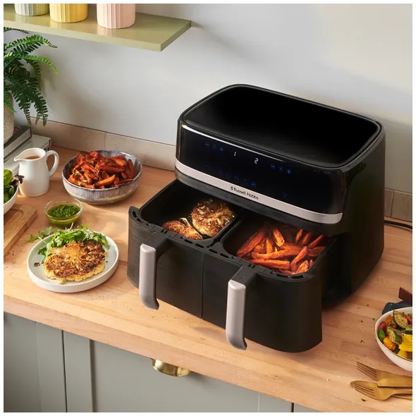 Select any of the 9 pre-set cooking functions* to take your mealtime effort from slow and steady to quick and ready! Whether you’re reheating leftovers or cooking from scratch, let the Russell Hobbs Satisfry Dual Basket Air Fryer take the strain. *Chips / Steak / Fish / Vegetables / Pizza / Chicken / Bake / Dehydrate / Reheat