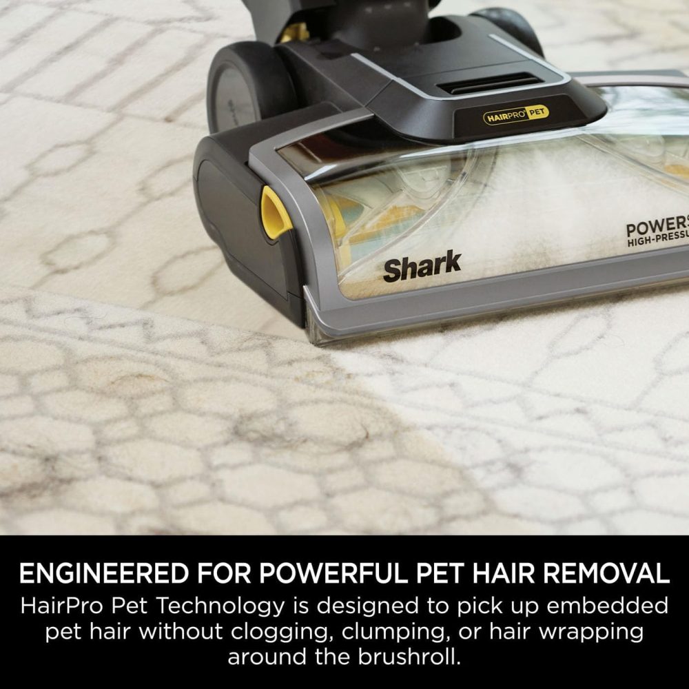 Deeper cleaning than a regular vacuum**: Quickly revive carpets and rugs for back-to-new results. A high-pressure spray cleans deep into carpet fibres without oversoaking them, evenly distributing water and Shark’s bespoke carpet cleaning formula. The high-speed brush-roll maintains contact with your carpets at every turn – 6 rows of uninterrupted bristles leave no cleaning gaps where dirt may be missed. Shark’s powerful suction extracts deep-down dirt, grime, hair and fur and liquid with a fast dry time, leaving carpets clean and revived, and instantly eliminating odours. Anti-clog suction allows hair to freely pass into the dirty water tank. Finish your clean with Dry Only mode to dry with suction, without dispensing water or cleaning solution.