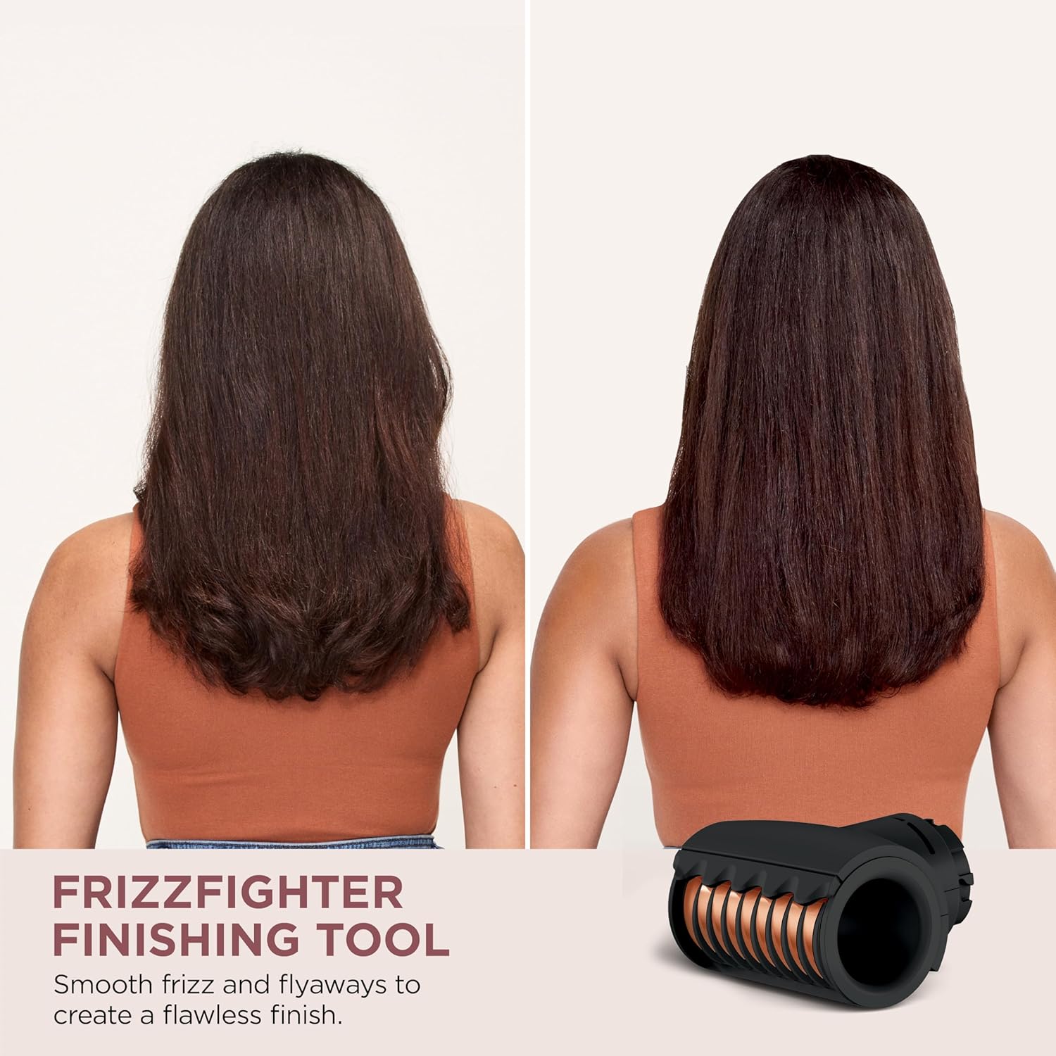 FrizzFighter Finishing Tool: Automatically attracts hair, fights frizz*, and smooths flyaways*. It uses Coanda airflow technology with two streams of air to collect and reduce flyways* on dry, straight or straightened hair.