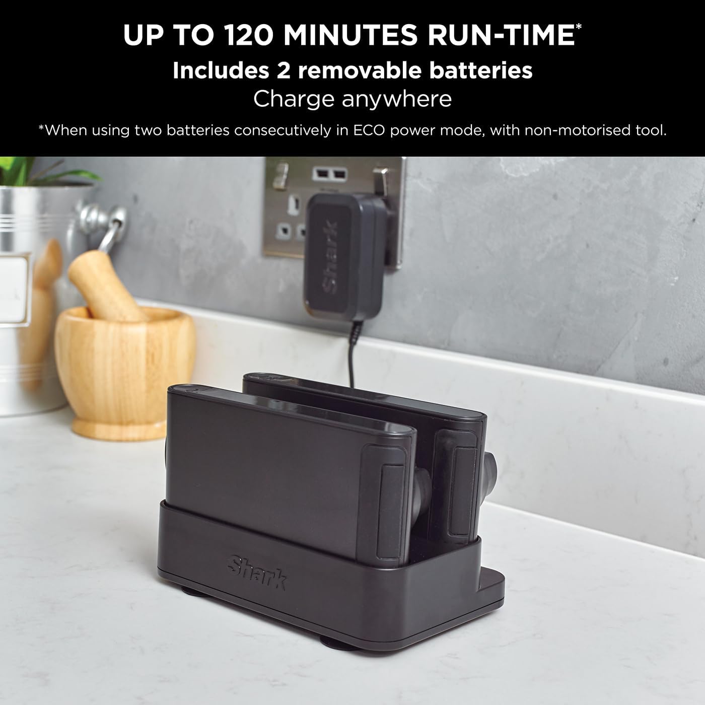 Enjoy up to 120 minutes of run-time** from a single charge with this twin battery model. The removable battery packs can be charged on or off the vacuum, wherever suits you – no need to be tied to a docking station. Charge both batteries at once in the Dual Charging Dock.
