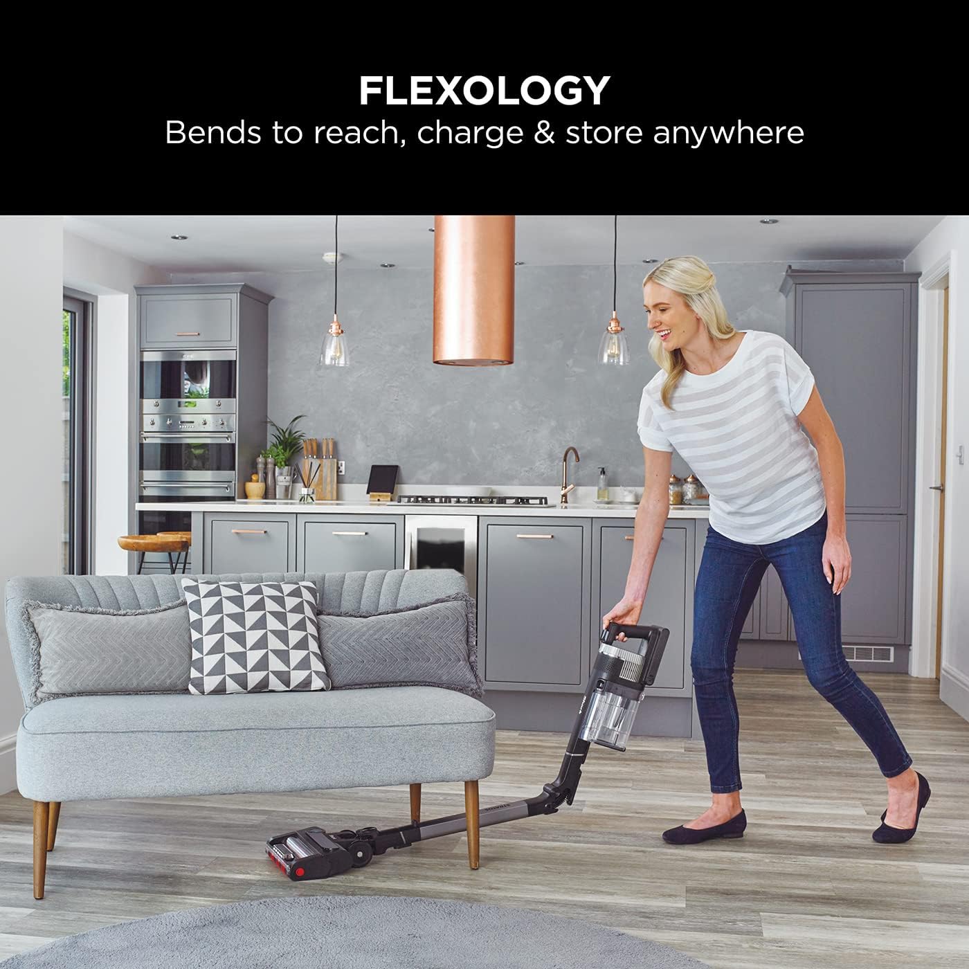 Flexology bends so you don’t have to. At the touch of a button, this flexible wand bends to reach and clean underneath low-lying furniture. When you’ve finished cleaning, fold down for compact, freestanding storage and charging.