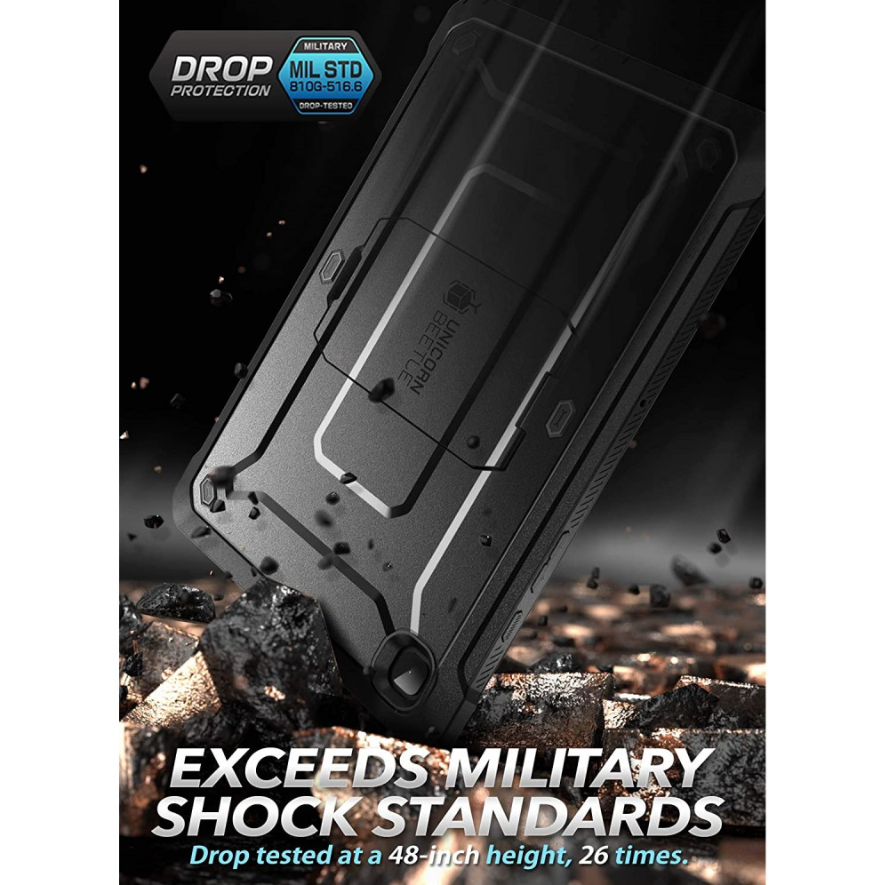 The Unicorn Beetle Tablet Cover comes with built-in screen protector made of scratch-resistant polycarbonate and shock-absorbing TPU bumpers defend against bumps and falls. The raised bezel protects screen & camera from surfaces. Built-in kickstand for hands-free viewing.
