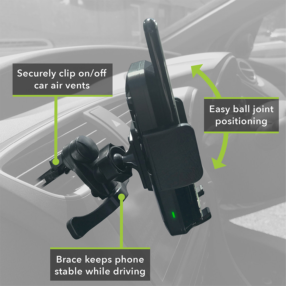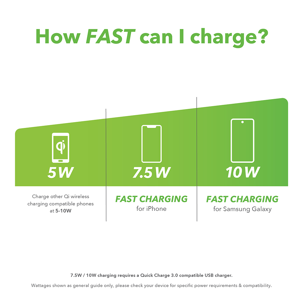 • Adjusts to fit all Qi Wireless Charging phones (5.5-10cm wide)