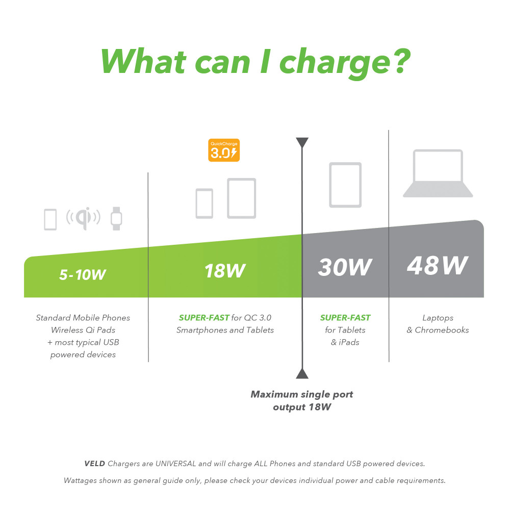 • Up to 50% faster than a standard 5W charger for non QC 3.0 devices