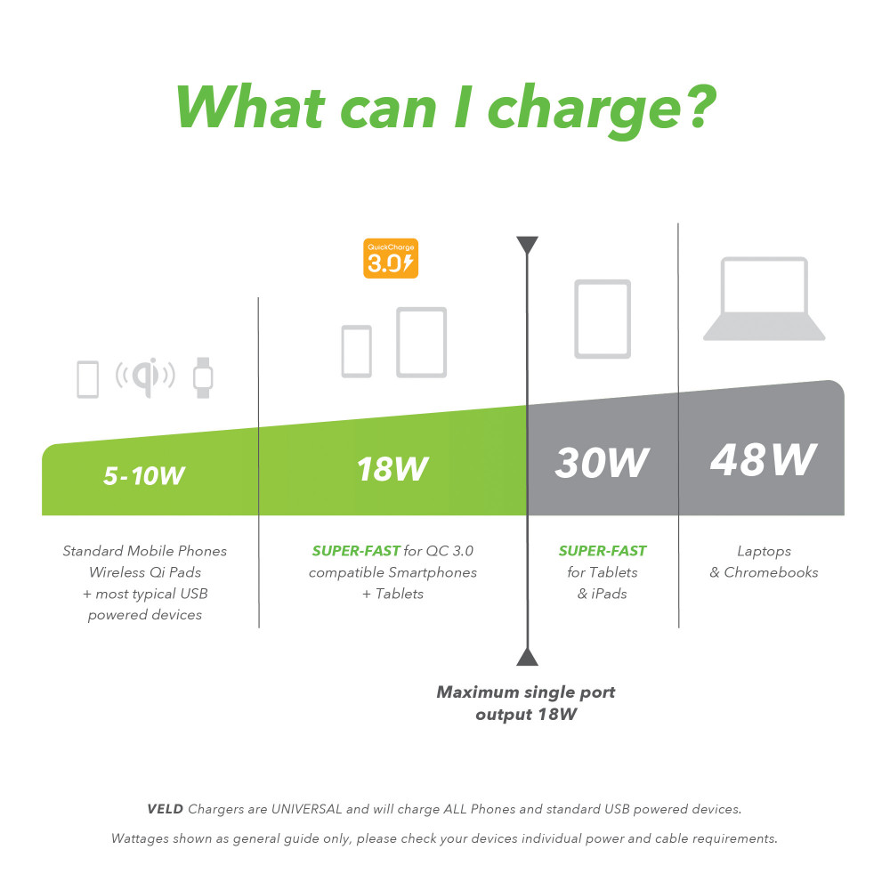 Offering up to 18W for Samsung and all QC 3.0 compatible Smartphones and Qi Wireless Chargers. plus a 12W USB-A port for all other USB powered devices.